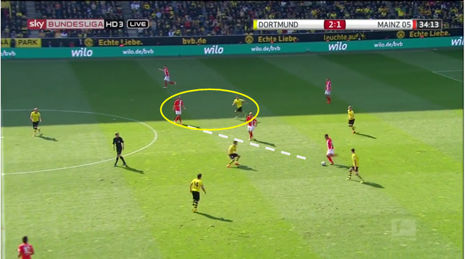 After intercepting the pass, Mkhitaryan is already in the Mainz half and a quick pass to Marco Reus puts him through on goal.