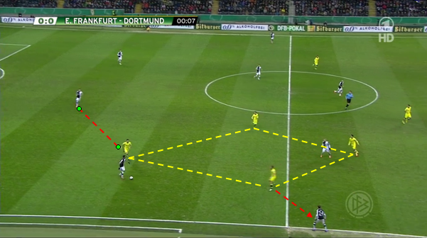 Lets take the above screenshot for example, Dortmund in a diamond-like pressing shape move to the ball side and apply pressure to win possession against Frankfurt. BVB striker Lewandowski positions himself to block the passing options to the player positioned between the two defenders and is simultaneously applying pressure to the player in possession restricting time and space in possession. The opponent under pressure may play long which gives Dortmund a higher chance of regaining possession through the defenders, or attempt to keep circulating the ball in the defensive/middle third. On many occasions we have seen players fall directly into Dortmund’s pressing trap. In the above screenshot if the ball is passed to the right sided CM he is quickly pressed by three players and if there is a turn over if possession, BVB have already bypassed most of Frankfurt’s lines and have a quicker route to goal as well as the numbers.