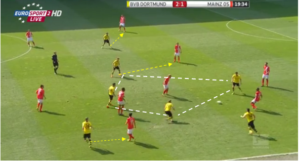In the same game, Dortmund again press immediately after losing the ball in the Mainz area