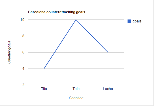 Barcelona had a front line of Messi, Sanchez, Pedro and Neymar very pacy players who are suited to a direct style. As teams had limited space in possession, the idea was to make use of space in transition. Barcelona’s added counter attacking option was evident, such that at New years 2014, they had scored the most counters in Europe. In the past three seasons, Barca scored the most goals through counter attacks under Gerardo Martino. A chart of Barcelona’s counterattack goals in the league: