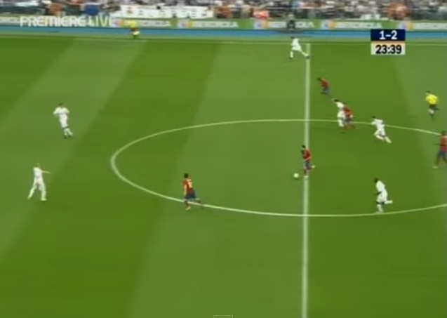The decision to play Messi centrally came in Barca’s historic 6-2 thrashing of Real Madrid. In a presentation, Pep showed videos of the game and explained his decision. He had noticed Madrid’s midfielders applying pressure to Toure, Xavi and Iniesta in midfield. It was almost as if they were man-marking them. Pep noticed this very early on and tried to counteract Madrid’s actions. Barcelona resulted to circulating the ball deep early on. Xavi and Yaya Toure were dropping very deep just ahead of the defense and at times on the same line. Barca’s midfielders circulated the ball in deep areas meaning Madrid who were man-marking pushed very high to press. Cannavaro and Metzelder were the two centerbacks in that game. The defensive duo stayed deep as the midfielders pushed forward to press. Pep said the reason for the centerbacks remaining deep was because they were scared of leaving space in behind for Messi and Henry running into from the flanks. The result was a very large space in between defense and midfield.