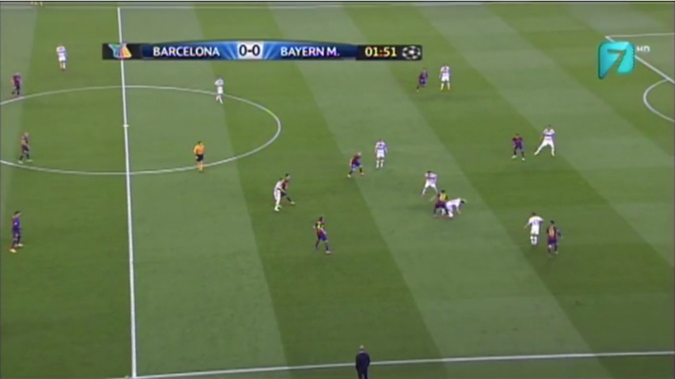 This was early in the game. Barcelona hunted down the ball like a pack of wolves. Notice how tight Iniesta is to his player, and Busquets is to Schweinsteiger. Messi also marks Rafinha, Neymar who swaps position with Suarez is also tight on Boateng with Suarez on Benatia. In this picture, Barcelona mark all passing options for Bernat in possession by being compact in the Bayern half. Alves presses the Bayern fullback and is able to win the ball.